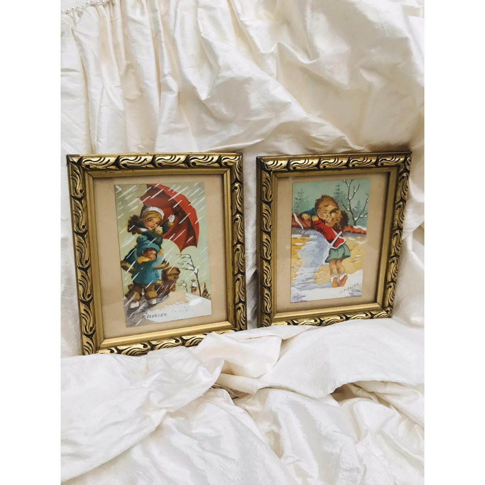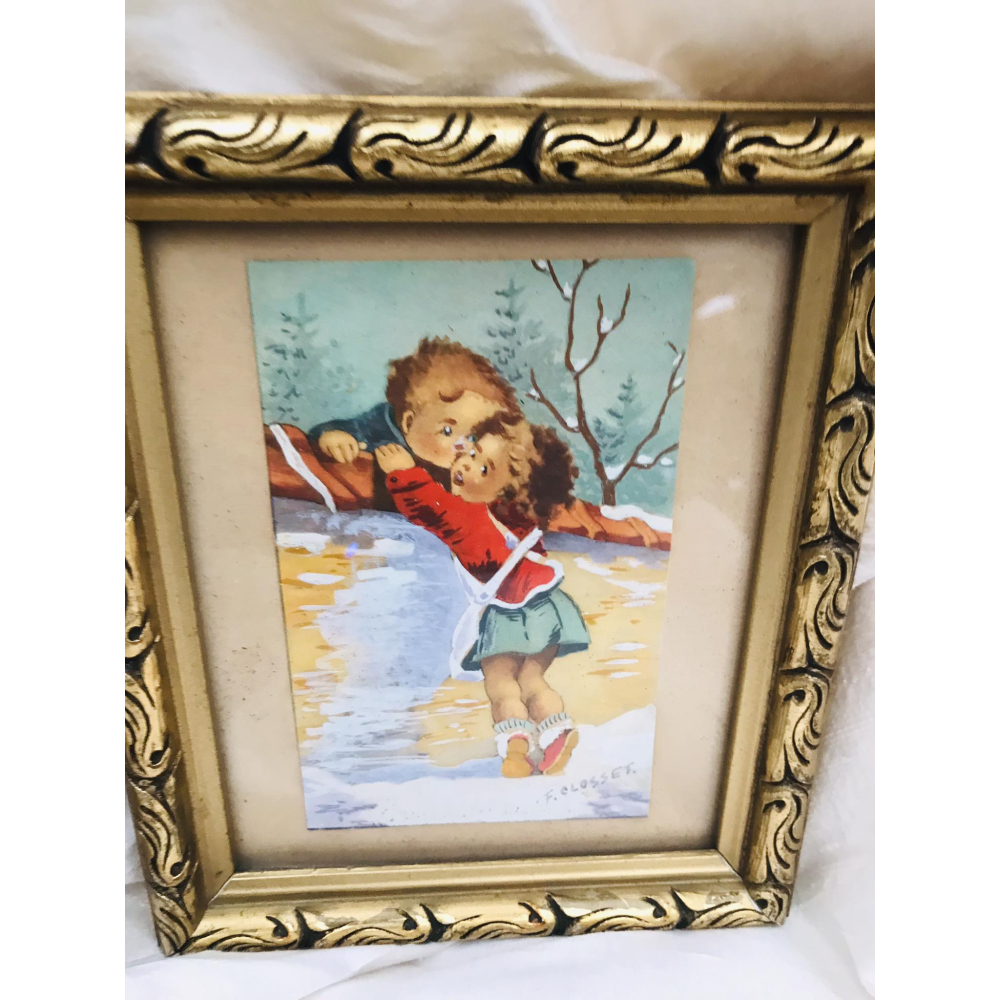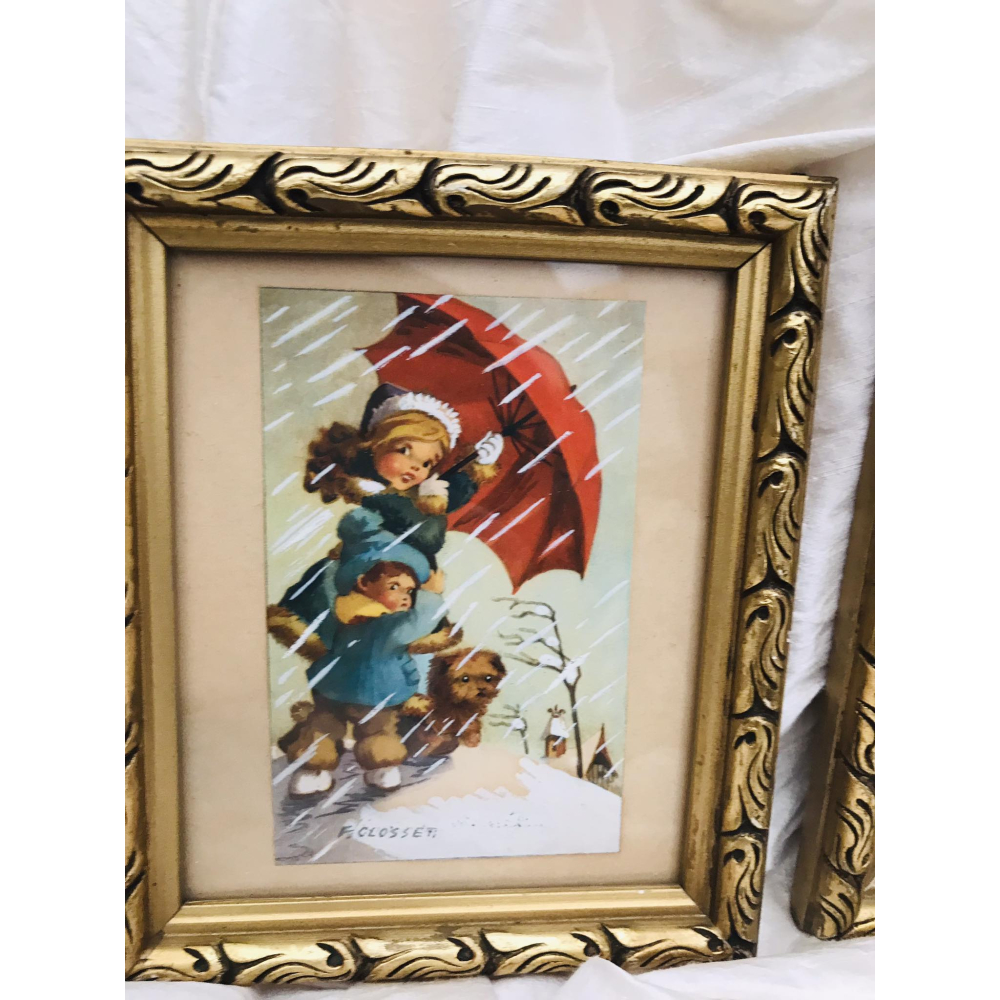 2 postkaartjes met schattige kindertafereeltjes in een mooi lijstje. 18cm op 15cm Prijs voor de 2 samen
