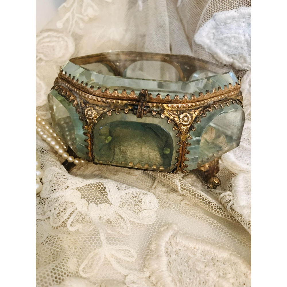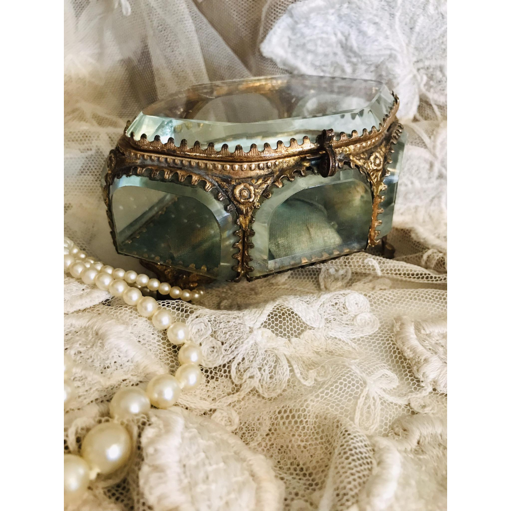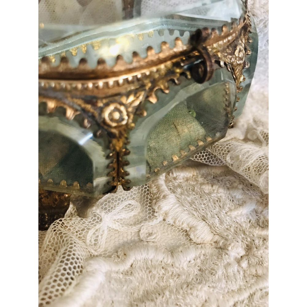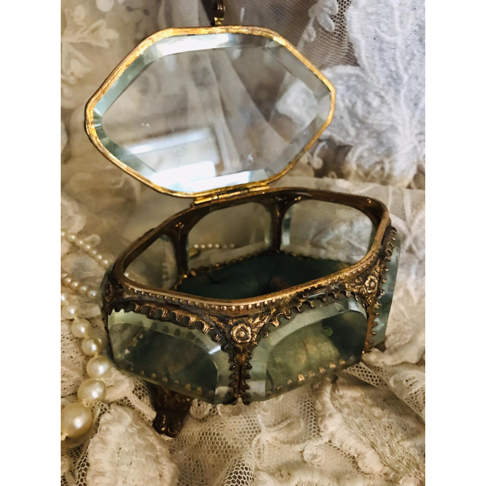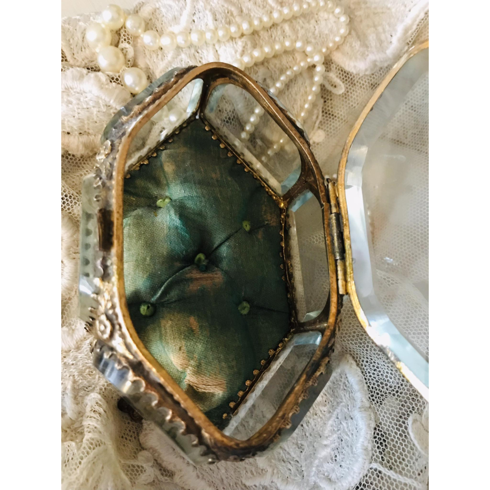 Dit 6 hoekig kistje met heel dik glas en prachtige versieringen in de messing is een streling voor het oog,