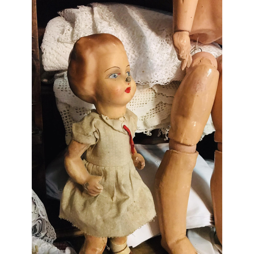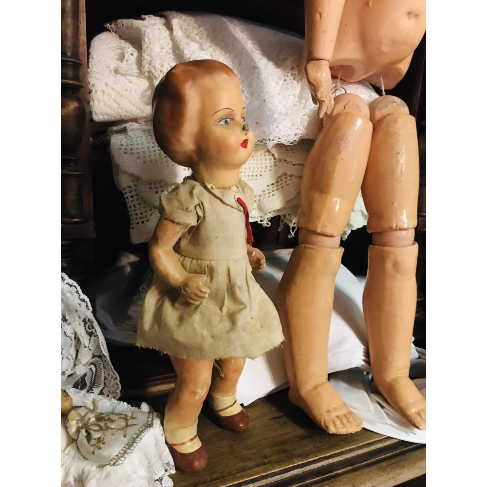 Antiek Frans popje gemaakt uit papier mache en helemaal handgeschilderd. Origineel kleedje, armpjes en benen kunnen bewegen, ze kan zowel zitten als staan. Beschadiging aan haar neusje, voor de rest in hele mooie staat. 36cm