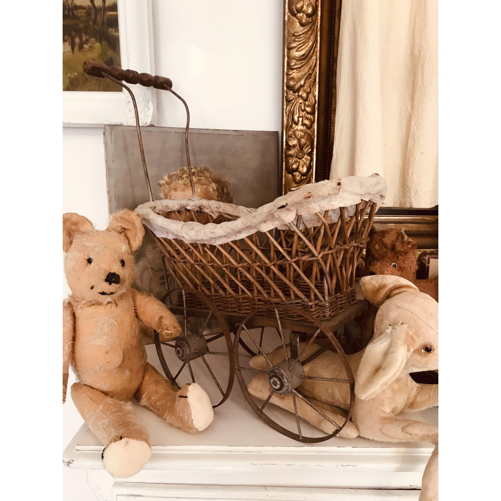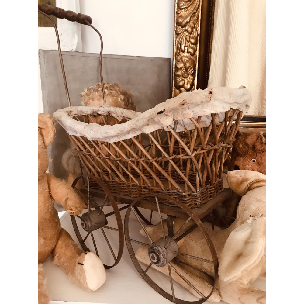 Nog intact stof is in shabby staat koetsje staat op ijzeren wieltjes 36cm lang 36cm hoog zonder handvat