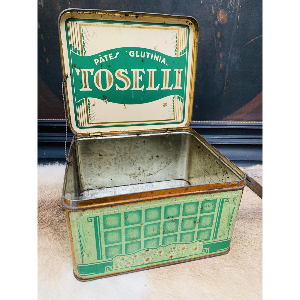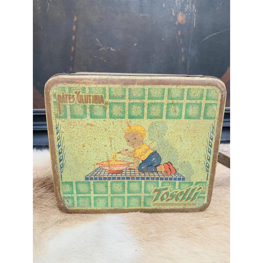 Super leuke oude blikken doos met een blond jongetje op die spaghetti eet. De doos is van het pasta merk Toselli 19cm op 22cm
