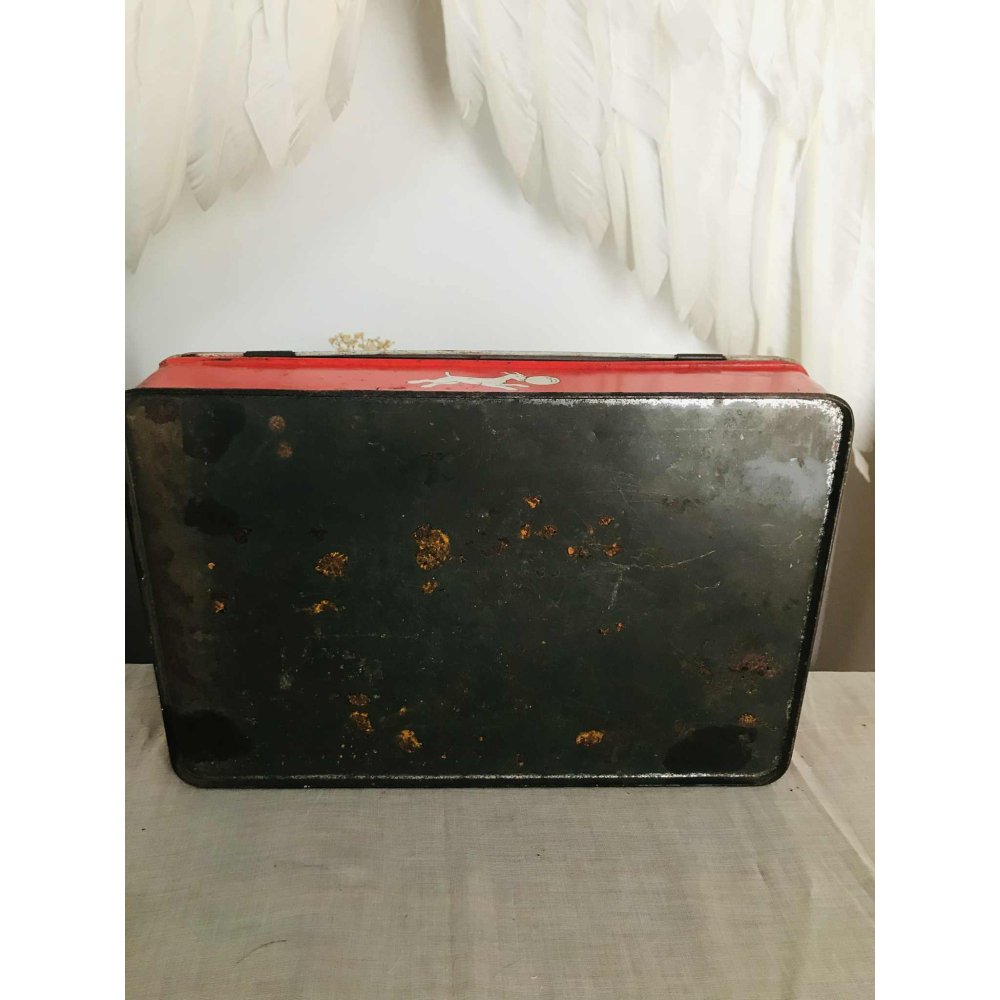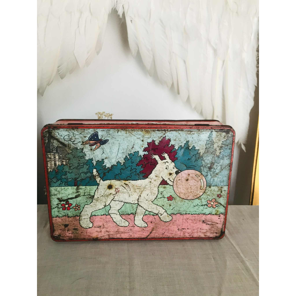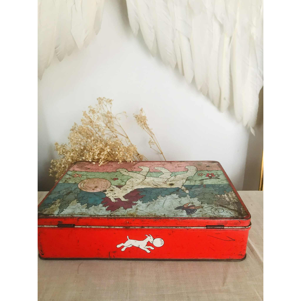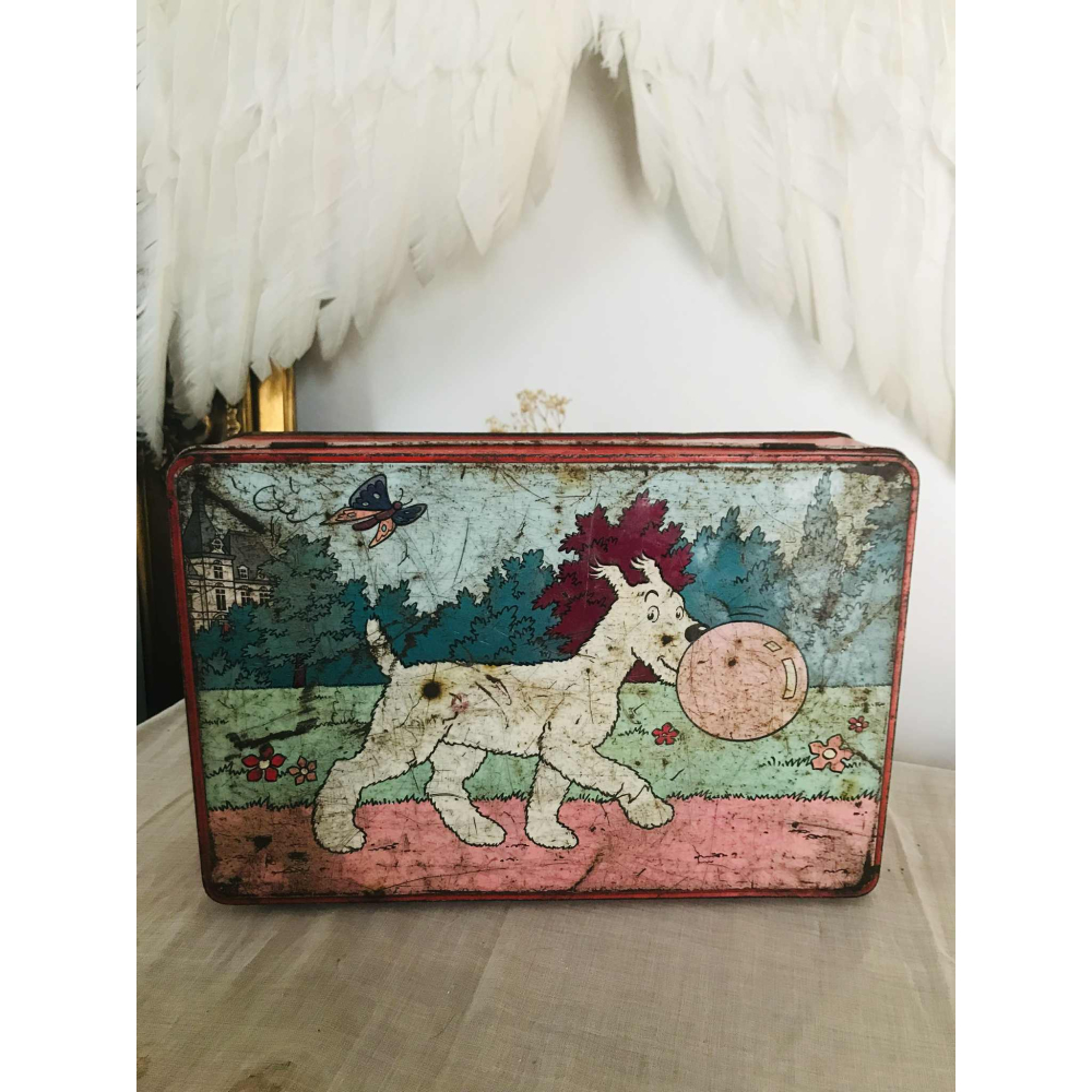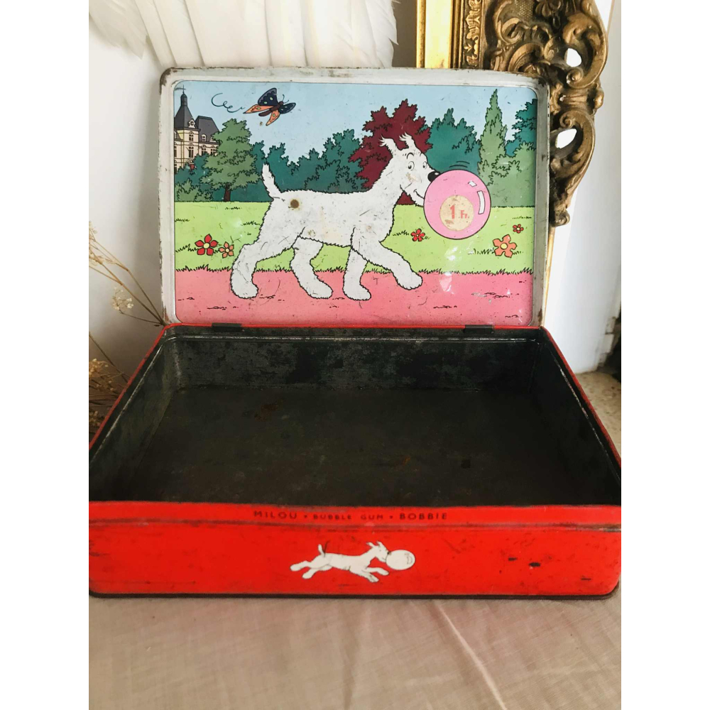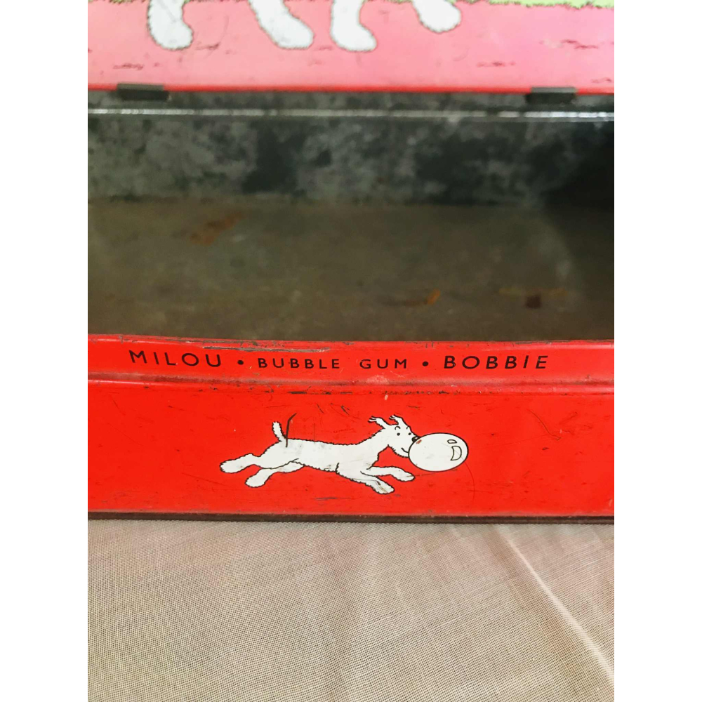 Op deze charmante vintage blikken doos staat Milou (Bobbie), de geliefde hond uit de Kuifje-strips, vrolijk een kauwgombel te blazen. De doos dateert uit de jaren 50-60 en werd oorspronkelijk gebruikt om "Milou Bubble Gum" in te verpakken. Het is nu een zeldzaam verzamelobject. De doos is versierd met kleurrijke, nostalgische illustraties op het deksel en de zijkanten, met levendige afbeeldingen uit het midden van de vorige eeuw die nog steeds de aandacht trekken. Hoewel er tekenen van ouderdom en slijtage te zien zijn, waaronder wat roest en oppervlakkige krasjes, blijven het karakter en de authenticiteit intact. Een prachtig stuk voor elke Kuifje-fan, liefhebber van vintage speelgoed of verzamelaar van reclamememorabilia. Perfect als decoratie of voor het bewaren van kleine schatten met een vleugje stripgeschiedenis.