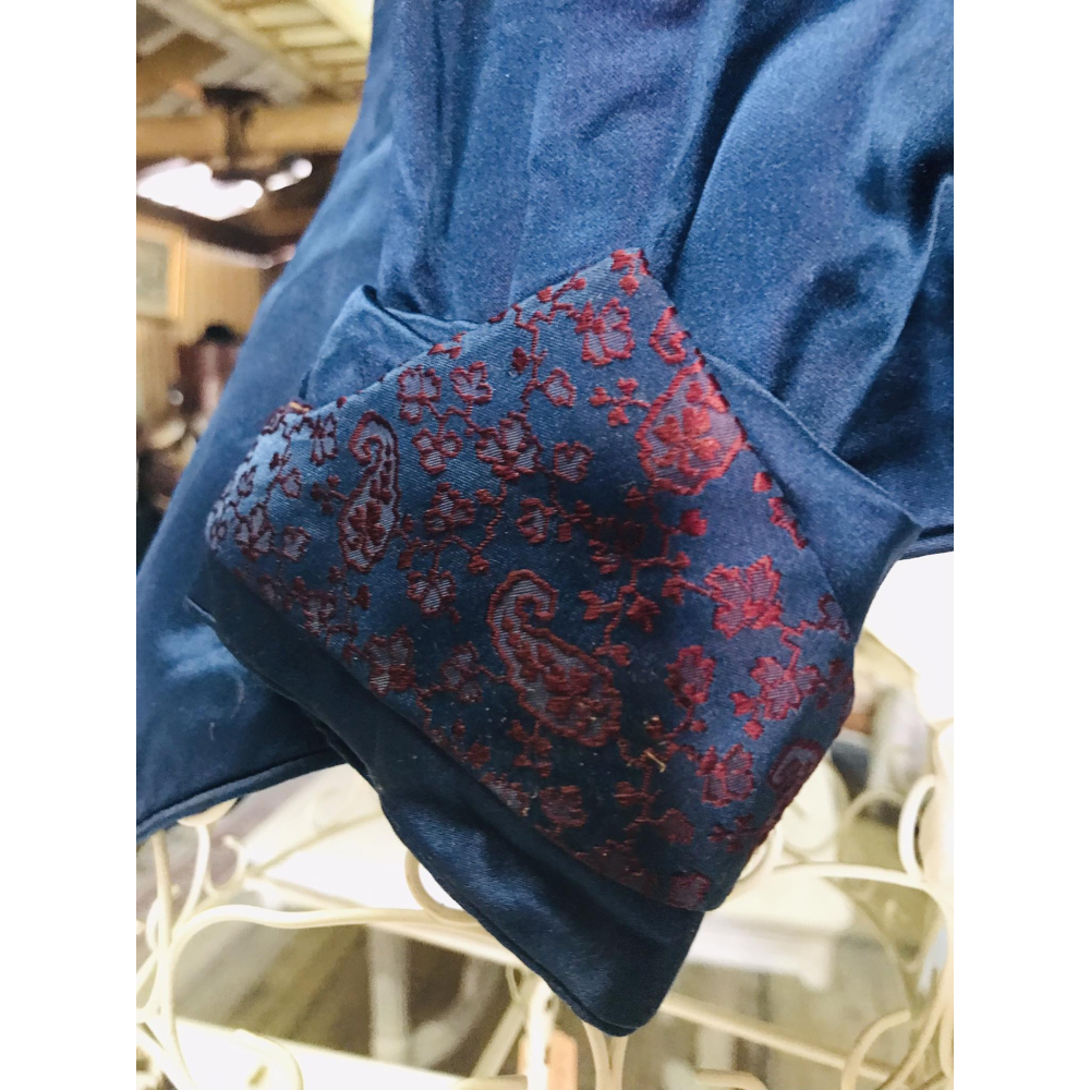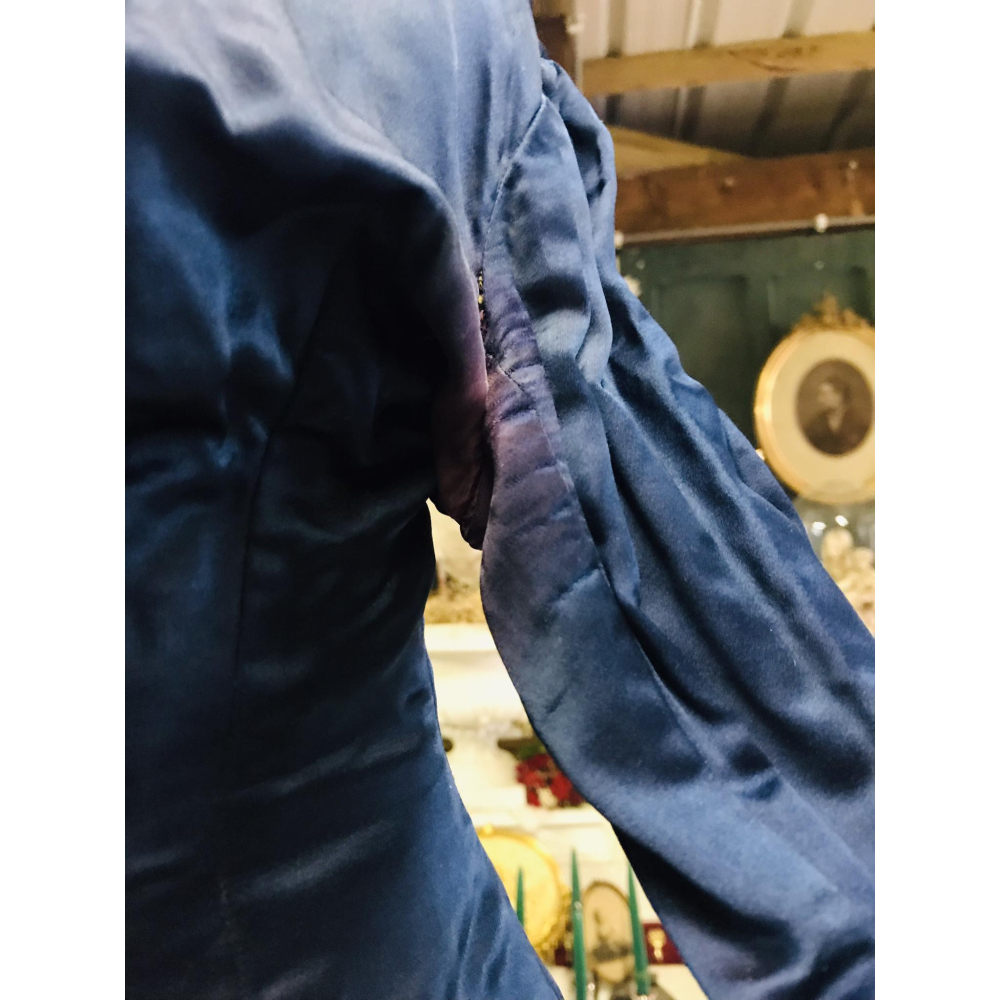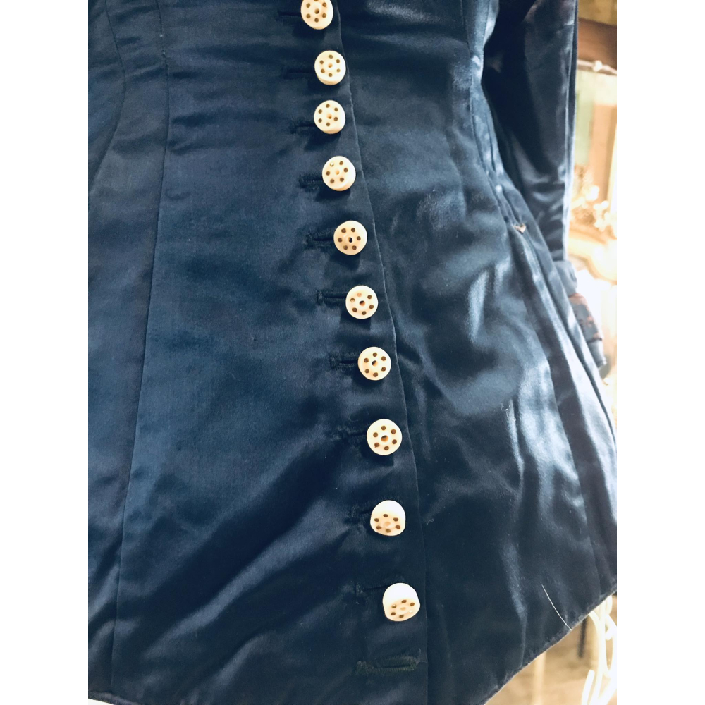 Streling voor het oog deze diepblauwe victoriaanse bodice, afgewerkt met mooie rode accenten op de mouwen en prachtige vleugels om de poep. Het kan in zijn geheel worden gekocht, met de metalen paspop en de bustle op de poep. Opgepast, de paspop is vintage en ook de bustle is geen antieke bustle! De bodice is een antiek stuk en heeft dus ook tekenen van de tand des tijds, geen erge scheuren of gaten, wel verkleuringen onder de oksels vooral en hier en daar een klein gaatje Bustle en paspopje kunnen eventueel ook apart worden verkocht Hoogte 1.20 Prijs compleet 210€ Bodice, paspopje en bustle