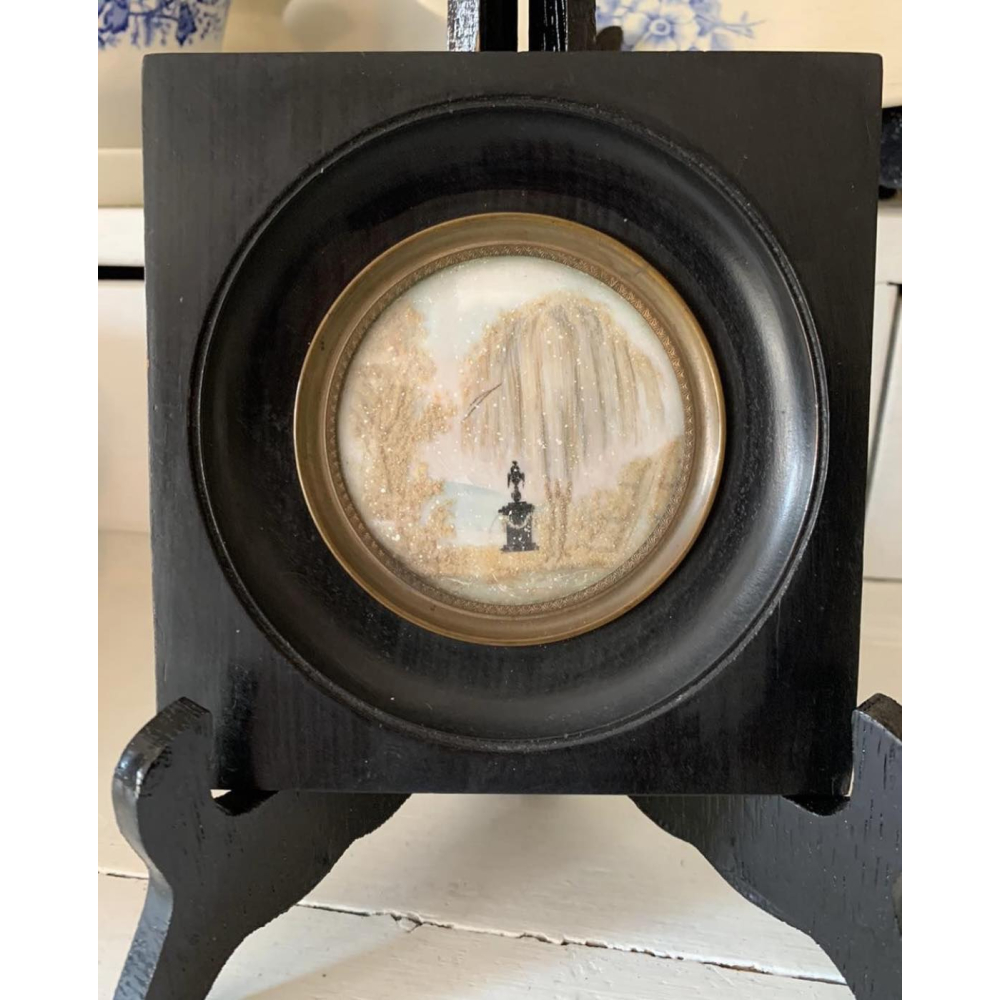 Deze Franse napoleon III rouw lijst is een waar kunstwerk je met echt mensenhaar van een dierbare overledene in verwerkt. Het is volledig handgemaakt op een ivoren plaatje. Deze lijstjes waren heel populair in de jaren 1800 vooral in de eerste helft. De treurwilg die wordt afgebeeld staat voor rouw maar ook kracht en gratie. Dit soort lijsten zijn zeldzaam geworden en worden door de liefhebber verzameld. De details in deze zijn ook echt prachtig. Nog 10 keer mooier in het echt