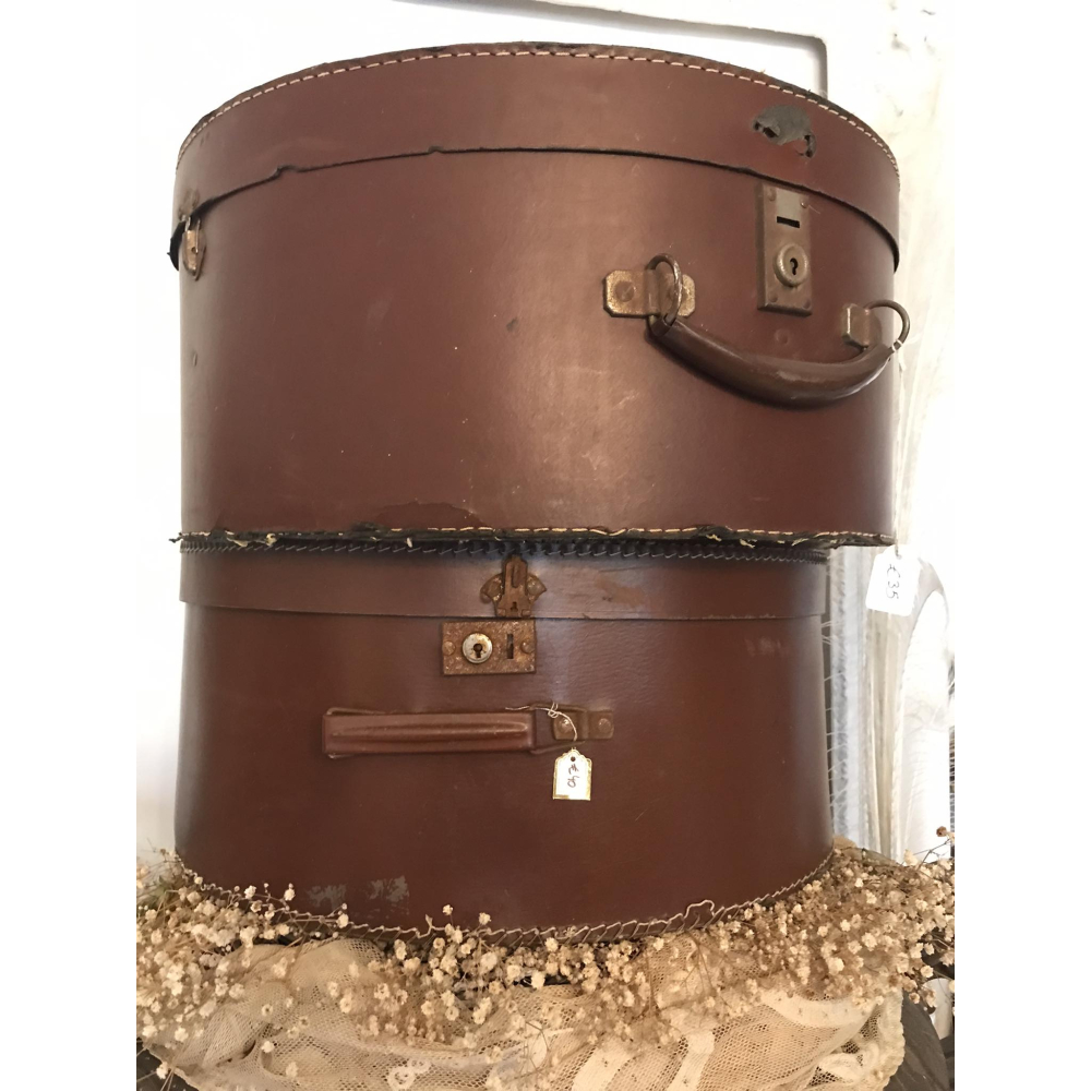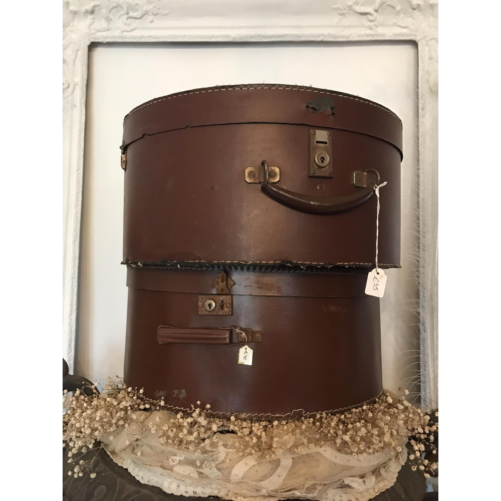 Deze grote oude hoedendozen zijn super leuk om mee te decoreren of om ergens een hoogteverschil te maken. Ze zijn in shabby staat, dus enkel nog ter decoratie. Hebben scheurtjes en beschadigingen. 44br 20h.