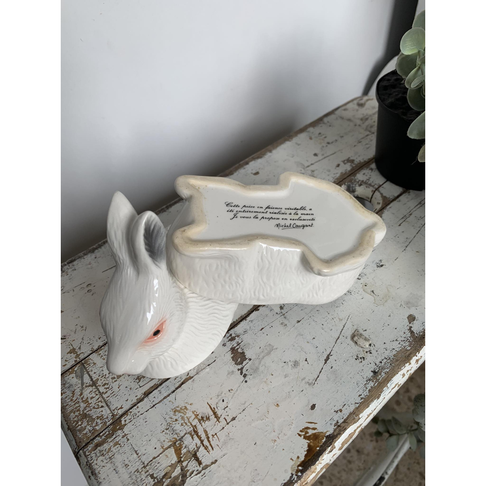 Michel Caugant is de zoon van een Franse patémaker en ontwierp terrines voor zijn vaders paté in de vorm van het dier waar de paté van gemaakt werd. Leuk object voor de verzamelaar en prachtig als decoratie! Allemaal met de hand gemaakt. Ze zijn nog in goede tot perfecte staat! Let wel op, elke schaal die gemaakt is door Caugant is met de hand gemaakt en geschilderd, ze zijn dus nooit helemaal identities en kunnen soms verschillen in verf. De boven en onderkanten sluiten ook niet altijd perfect op elkaar doordat ze handgemaakt zijn. Informeer zeker ook eens naar mijn andere zoekertje voor meer caugant patéschalen Dit is een klein schaaltje