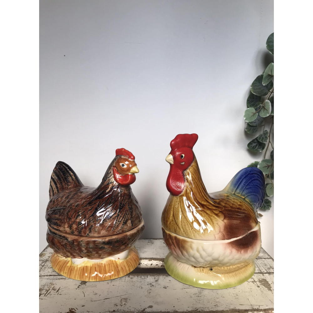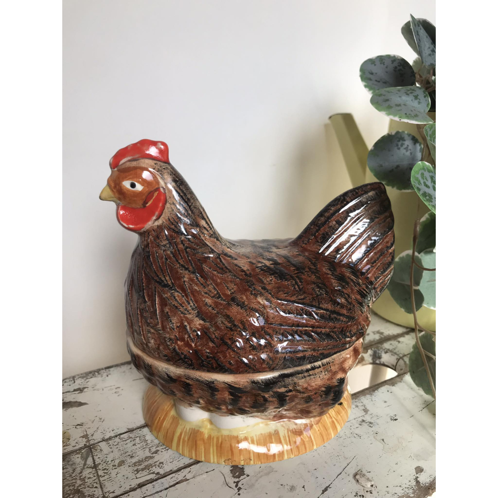 Michel Caugant is de zoon van een Franse patémaker en ontwierp terrines voor zijn vaders paté in de vorm van het dier waar de paté van gemaakt werd. Leuk object voor de verzamelaar en prachtig als decoratie! Allemaal met de hand gemaakt. Ze zijn nog in goede tot perfecte staat! Let wel op, elke schaal die gemaakt is door Caugant is met de hand gemaakt en geschilderd, ze zijn dus nooit helemaal identities en kunnen soms verschillen in verf. De boven en onderkanten sluiten ook niet altijd perfect op elkaar doordat ze handgemaakt zijn. Informeer zeker ook eens naar onze andere zoekertje voor meer caugant patéschalen Haan 20hoog 19cm lang Kip 16lang 18hoog