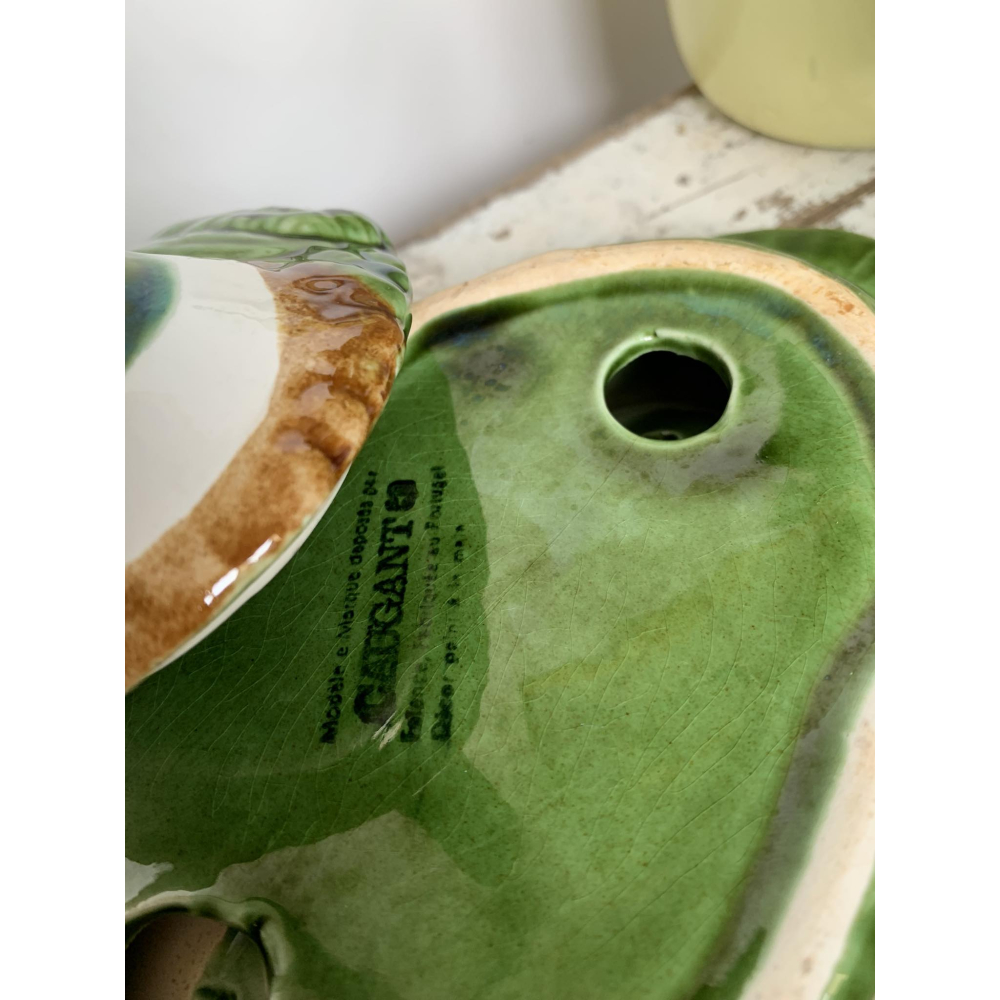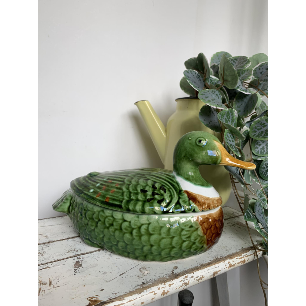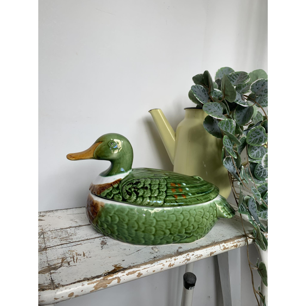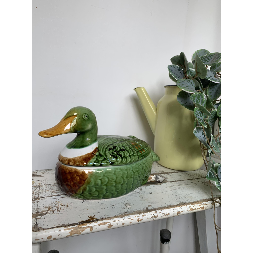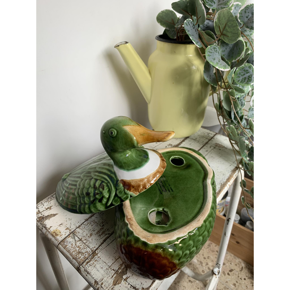 Michel Caugant is de zoon van een Franse patémaker en ontwierp terrines voor zijn vaders paté in de vorm van het dier waar de paté van gemaakt werd. Leuk object voor de verzamelaar en prachtig als decoratie! Allemaal met de hand gemaakt. Ze zijn nog in goede tot perfecte staat! Let wel op, elke schaal die gemaakt is door Caugant is met de hand gemaakt en geschilderd, ze zijn dus nooit helemaal identities en kunnen soms verschillen in verf. De boven en onderkanten sluiten ook niet altijd perfect op elkaar doordat ze handgemaakt zijn. Informeer zeker ook eens naar mijn andere zoekertje voor meer caugant patéschalen Deze kleur bestaat in verschillende maten, dit is de grote schaal 14 cm hoog 22cm lang (snavel-staart) Grotere schaal