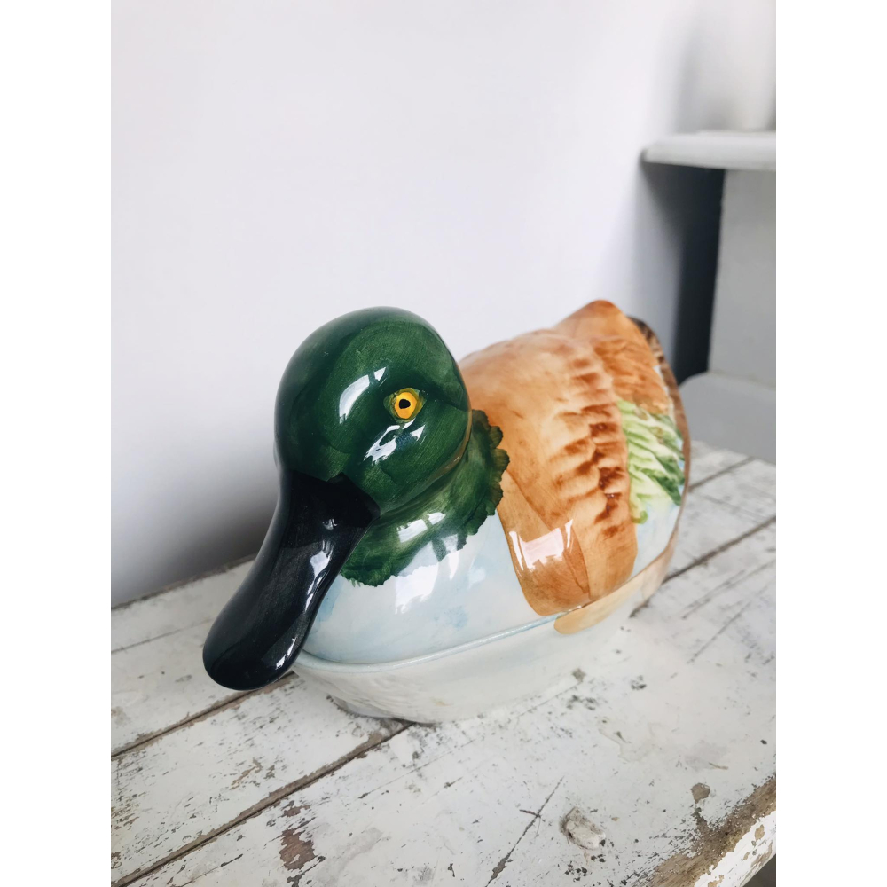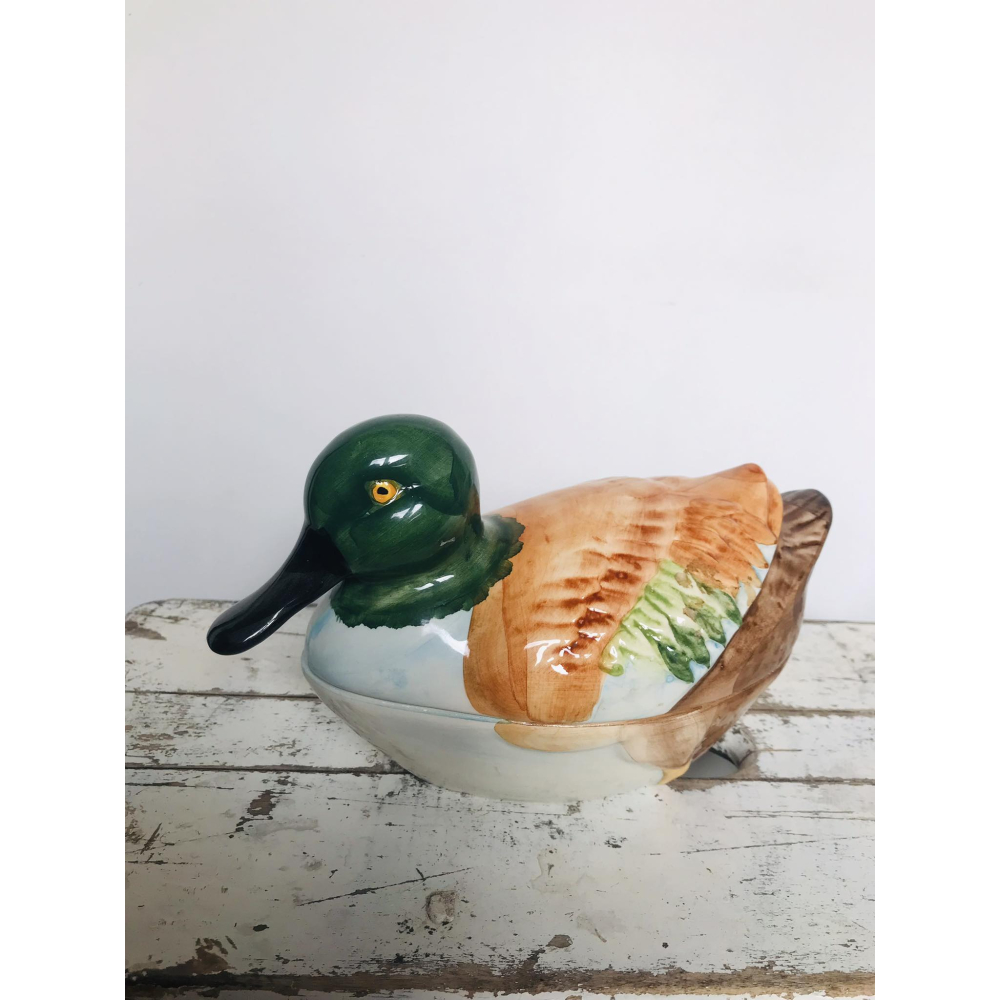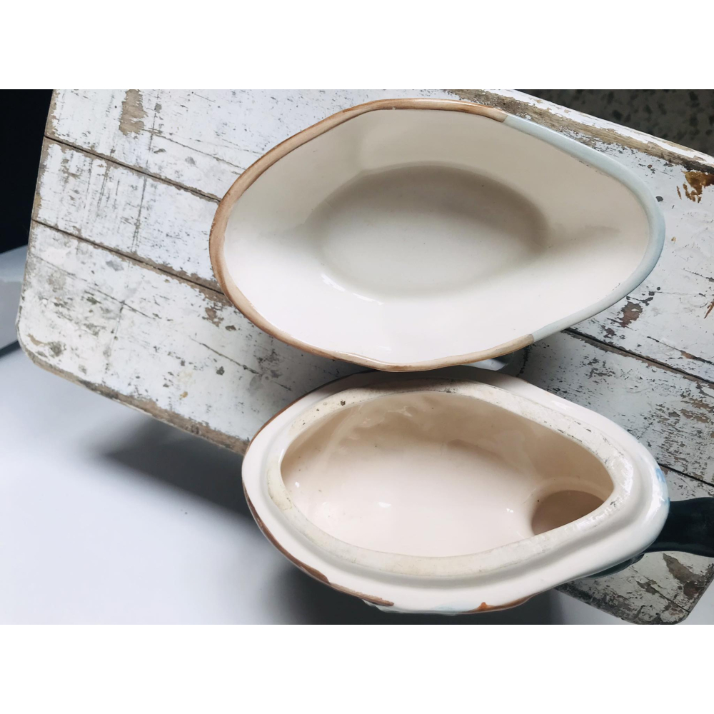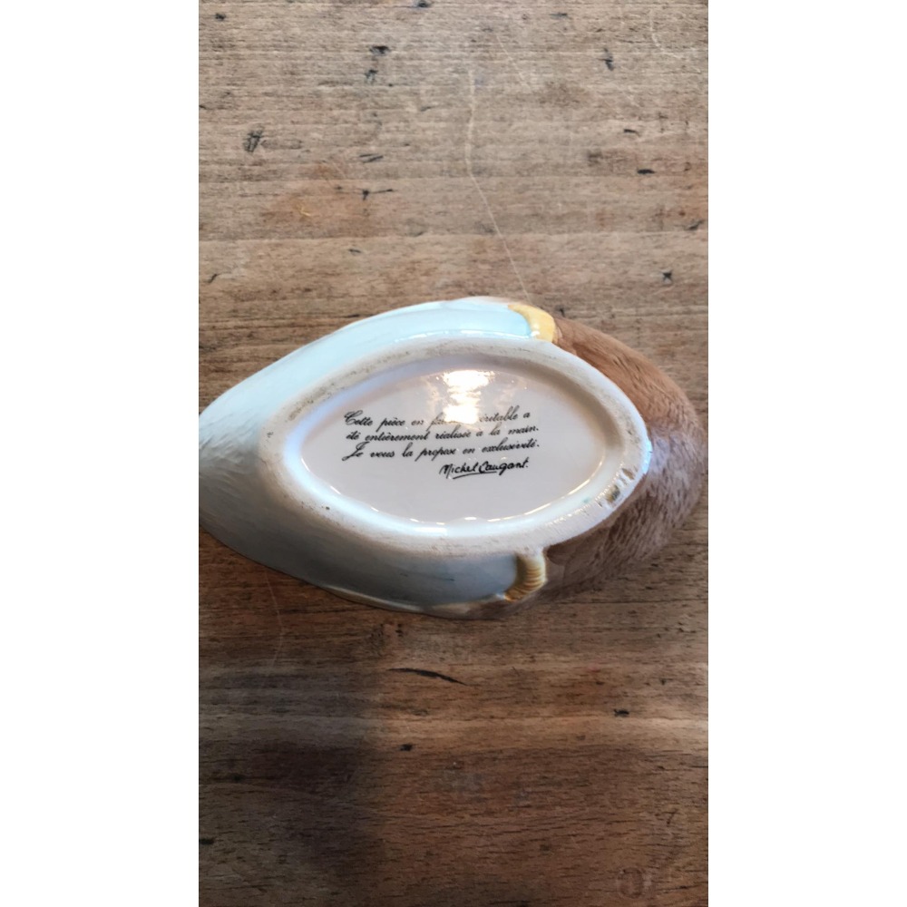 We hebben er hier al enkele laten passeren en zijn zelf ook helemaal verkocht aan de patéschalen van Michel Caugant Michel Caugant is de zoon van een Franse patémaker en ontwierp terrines voor zijn vaders paté in de vorm van het dier waar de paté van gemaakt werd. Leuk object voor de verzamelaar en prachtig als decoratie! Allemaal met de hand gemaakt. Ze zijn nog in goede tot perfecte staat! Let wel op, elke schaal die gemaakt is door Caugant is met de hand gemaakt en geschilderd, ze zijn dus nooit helemaal identities en kunnen soms verschillen in verf. De boven en onderkanten sluiten ook niet altijd perfect op elkaar doordat ze handgemaakt zijn. Informeer zeker ook eens naar mijn andere zoekertje voor meer caugant patéschalen Dit is een grotere schaal 20 lang