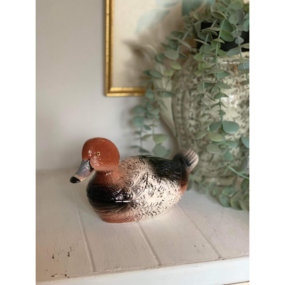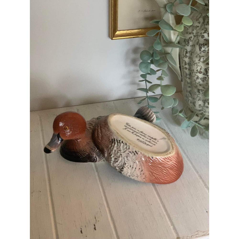 Dit met de hand gemaakte pateschaaltje in de vorm van een eend is van Michel Caugant. Michel Caugant is de zoon van een Franse patémaker en ontwierp terrines voor zijn vaders paté in de vorm van het dier waar de paté van gemaakt werd. Leuk object voor de verzamelaar en prachtig als decoratie! Allemaal met de hand gemaakt. nog in goede tot perfecte staat! Let wel op, elke schaal die gemaakt is door Caugant is met de hand gemaakt en geschilderd, ze zijn dus nooit helemaal identities en kunnen soms verschillen in verf. De boven en onderkanten sluiten ook niet altijd perfect op elkaar doordat ze handgemaakt zijn.