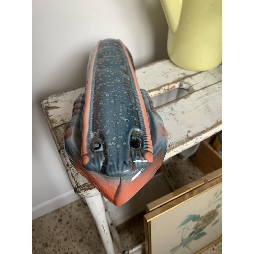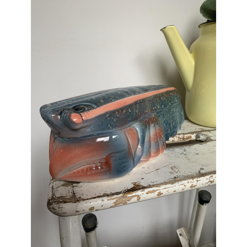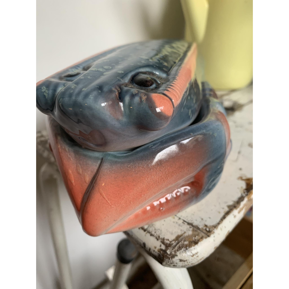 Michel Caugant is de zoon van een Franse patémaker en ontwierp terrines voor zijn vaders paté in de vorm van het dier waar de paté van gemaakt werd. Leuk object voor de verzamelaar en prachtig als decoratie! Allemaal met de hand gemaakt. Ze zijn nog in goede tot perfecte staat! Let wel op, elke schaal die gemaakt is door Caugant is met de hand gemaakt en geschilderd, ze zijn dus nooit helemaal identities en kunnen soms verschillen in verf. De boven en onderkanten sluiten ook niet altijd perfect op elkaar doordat ze handgemaakt zijn. Deze schaal heeft een beschadiging aan de binnenkant, is helemaal niet zichtbaar als de schaal dicht gepresenteerd wordt, enkel als je de schaal open legt. Vandaar de aangepaste prijs