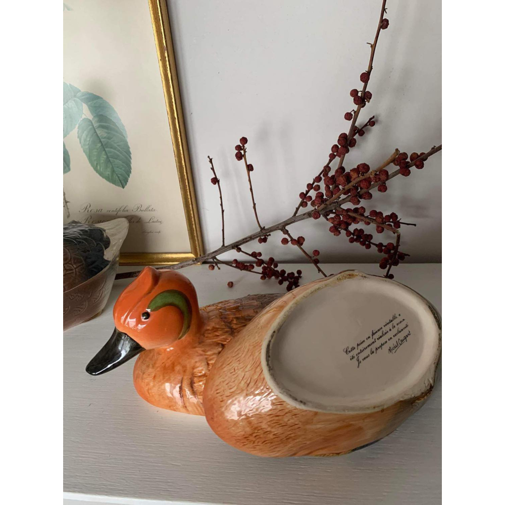 Dit met de hand gemaakte pateschaaltje in de vorm van een eend is van Michel Caugant. Michel Caugant is de zoon van een Franse patémaker en ontwierp terrines voor zijn vaders paté in de vorm van het dier waar de paté van gemaakt werd. Leuk object voor de verzamelaar en prachtig als decoratie! Allemaal met de hand gemaakt. nog in goede tot perfecte staat! Let wel op, elke schaal die gemaakt is door Caugant is met de hand gemaakt en geschilderd, ze zijn dus nooit helemaal identities en kunnen soms verschillen in verf. De boven en onderkanten sluiten ook niet altijd perfect op elkaar doordat ze handgemaakt zijn.