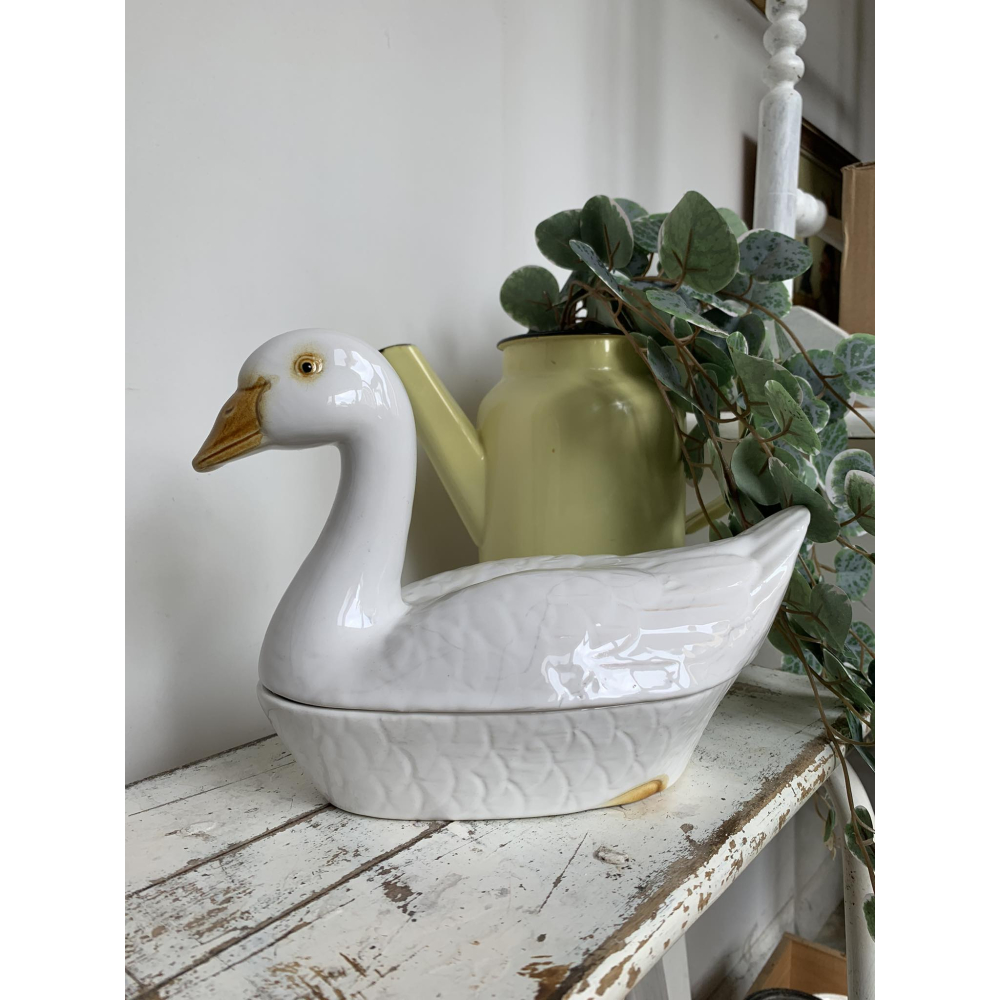 Michel Caugant is de zoon van een Franse patémaker en ontwierp terrines voor zijn vaders paté in de vorm van het dier waar de paté van gemaakt werd. Leuk object voor de verzamelaar en prachtig als decoratie! Allemaal met de hand gemaakt. Ze zijn nog in goede tot perfecte staat! Let wel op, elke schaal die gemaakt is door Caugant is met de hand gemaakt en geschilderd, ze zijn dus nooit helemaal identities en kunnen soms verschillen in verf. De boven en onderkanten sluiten ook niet altijd perfect op elkaar doordat ze handgemaakt zijn. Informeer zeker ook eens naar mijn andere zoekertje voor meer caugant patéschalen 18 cm hoog 24cm lang (snavel-staart) Heeft een bakfoutje op het hoofd, is geen beschadiging maar een foutje tijdens het bakken en schilderen van de schaal Moeilijk te vinden schaal, door bakfout mindere prijs