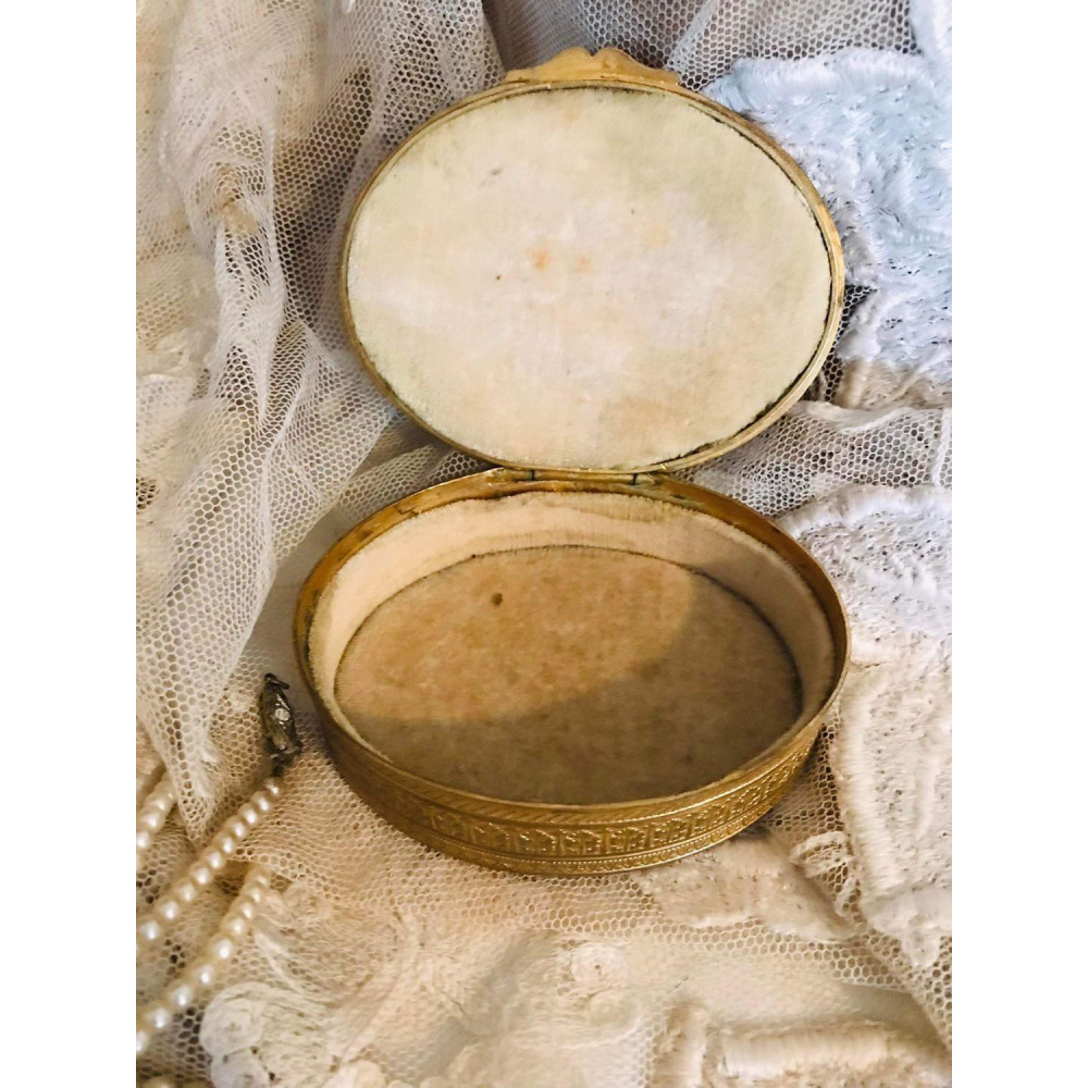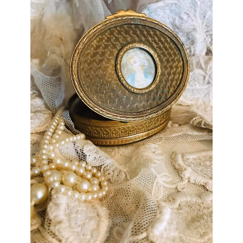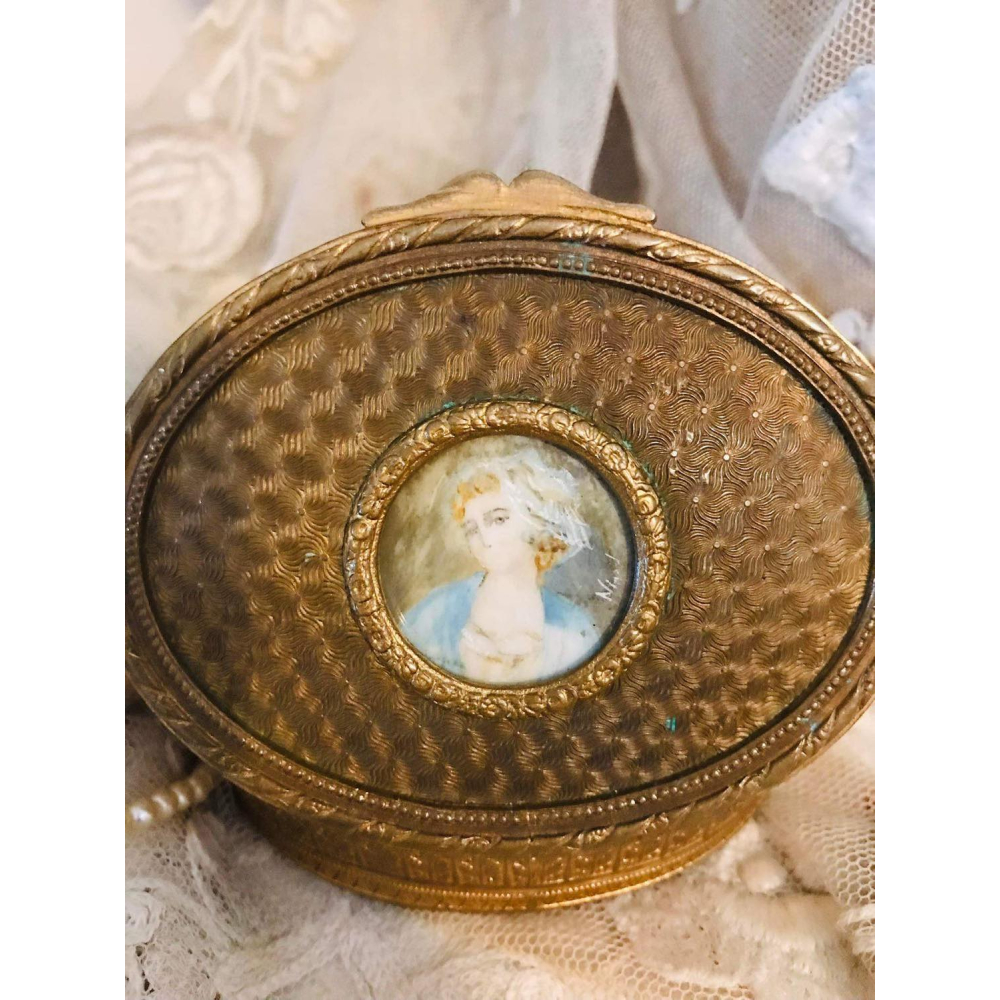 Bronzen juwelen doosje uit Frankrijk uit de Napoleon III periode, eind 19e eeuw. In het midden zit een handgeschilderd portretje, vermoedelijk op porselein. Uniek en prachtig item