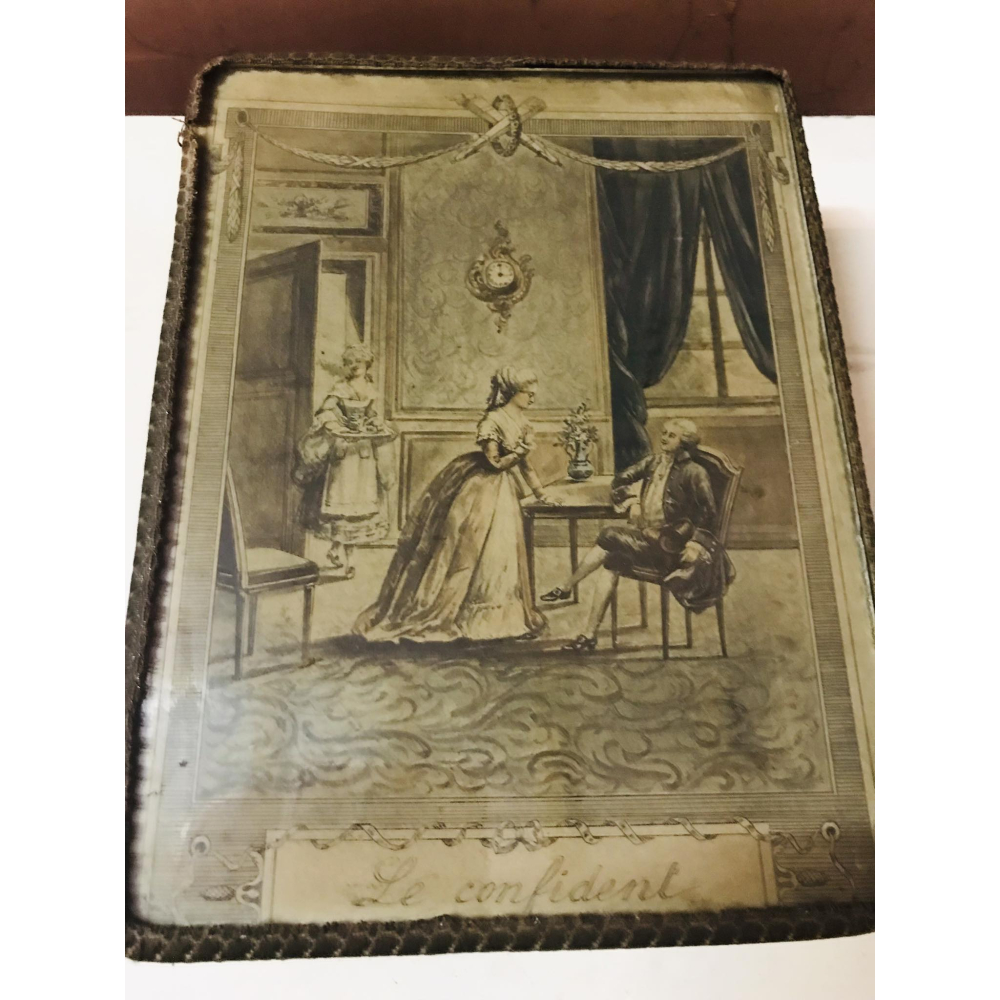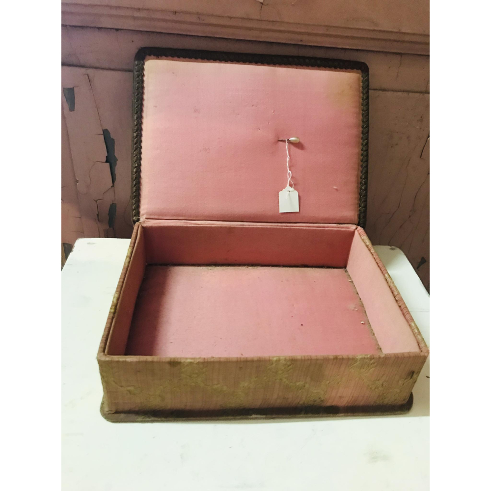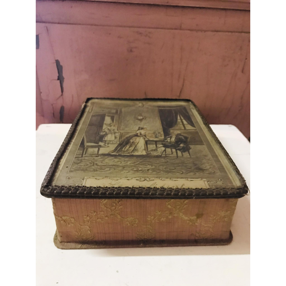 Leuk oud stoffen doosje met bovenaan een mooie prent. De prent is afgedekt met een glazen plaatje, De roze stof binnenin is ook nog in mooie staat. 17 op 22cm