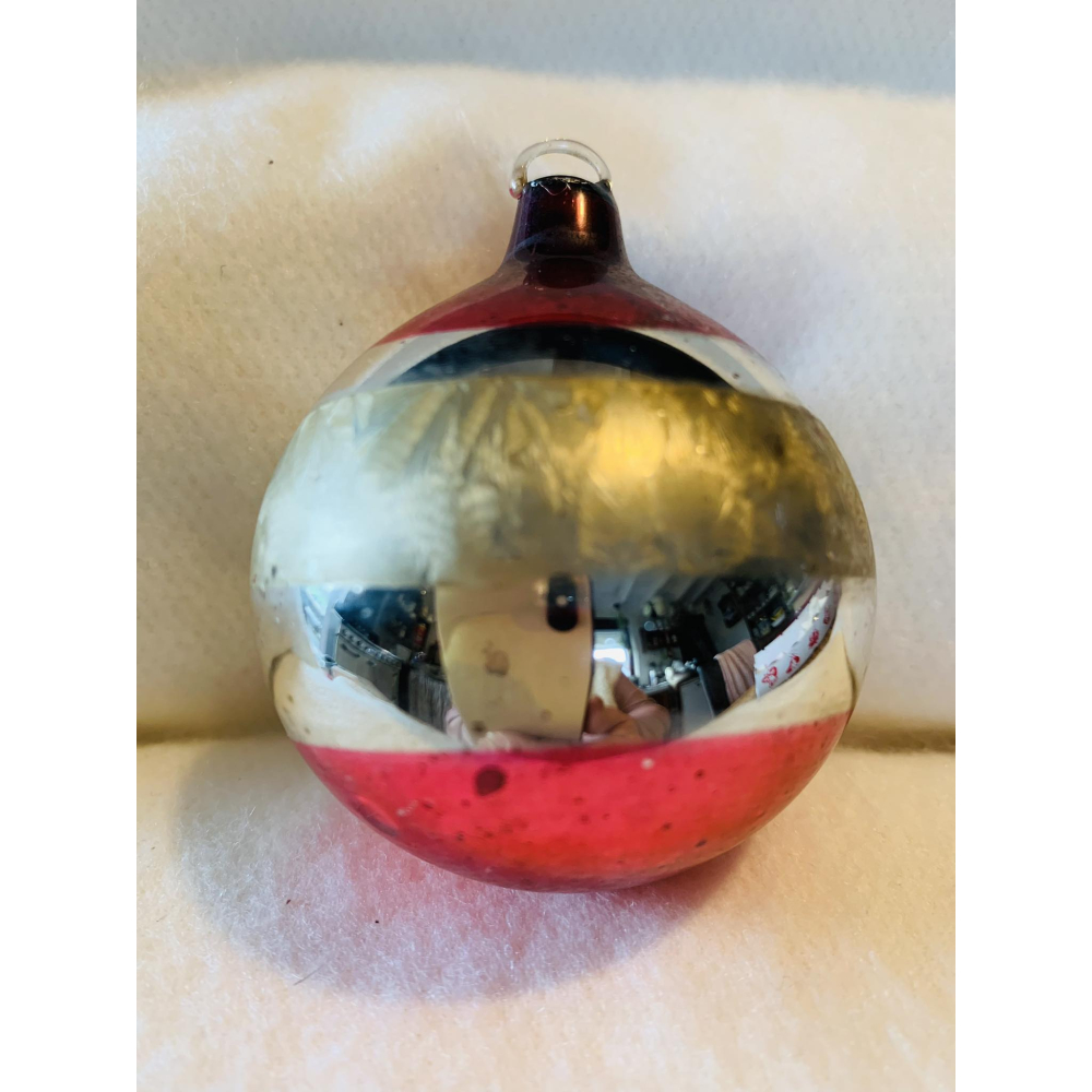 De kerstbal heeft in het midden een frost effect in mooie staat, bovenaan en onderaan afgewerkt met een rode streep.