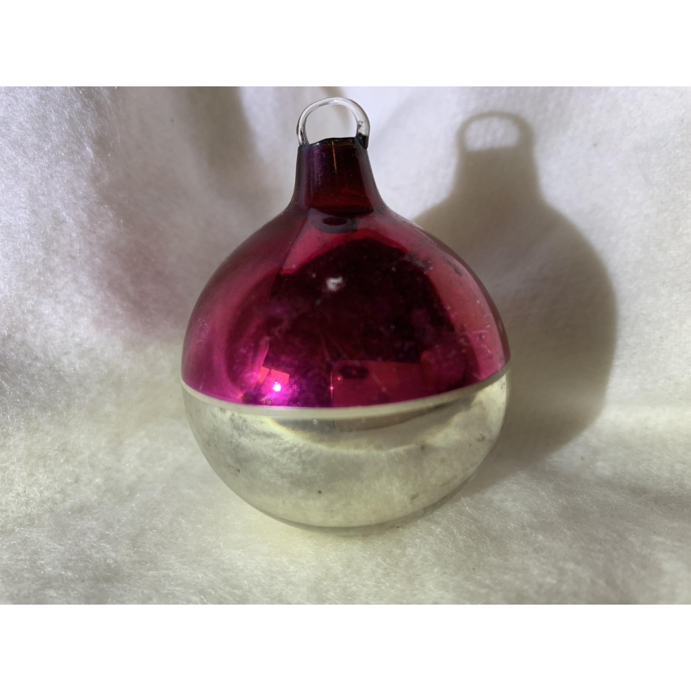 De kerstbal heeft in het een donker roze/rode kleur die met de hand is ingekleurd in het midden een streep en onderkant zilver.