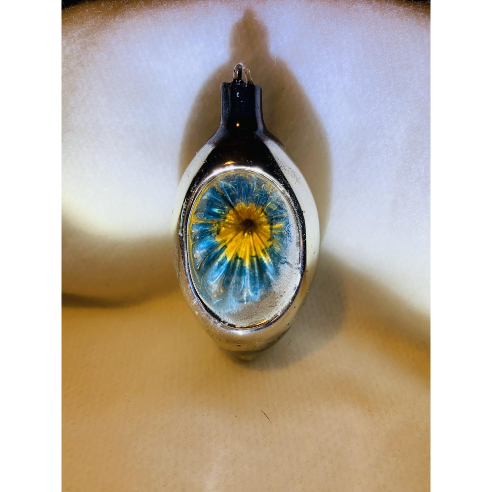 De kerstbal heeft een zilveren kleur met in de deuk een blauw en gele kleur.