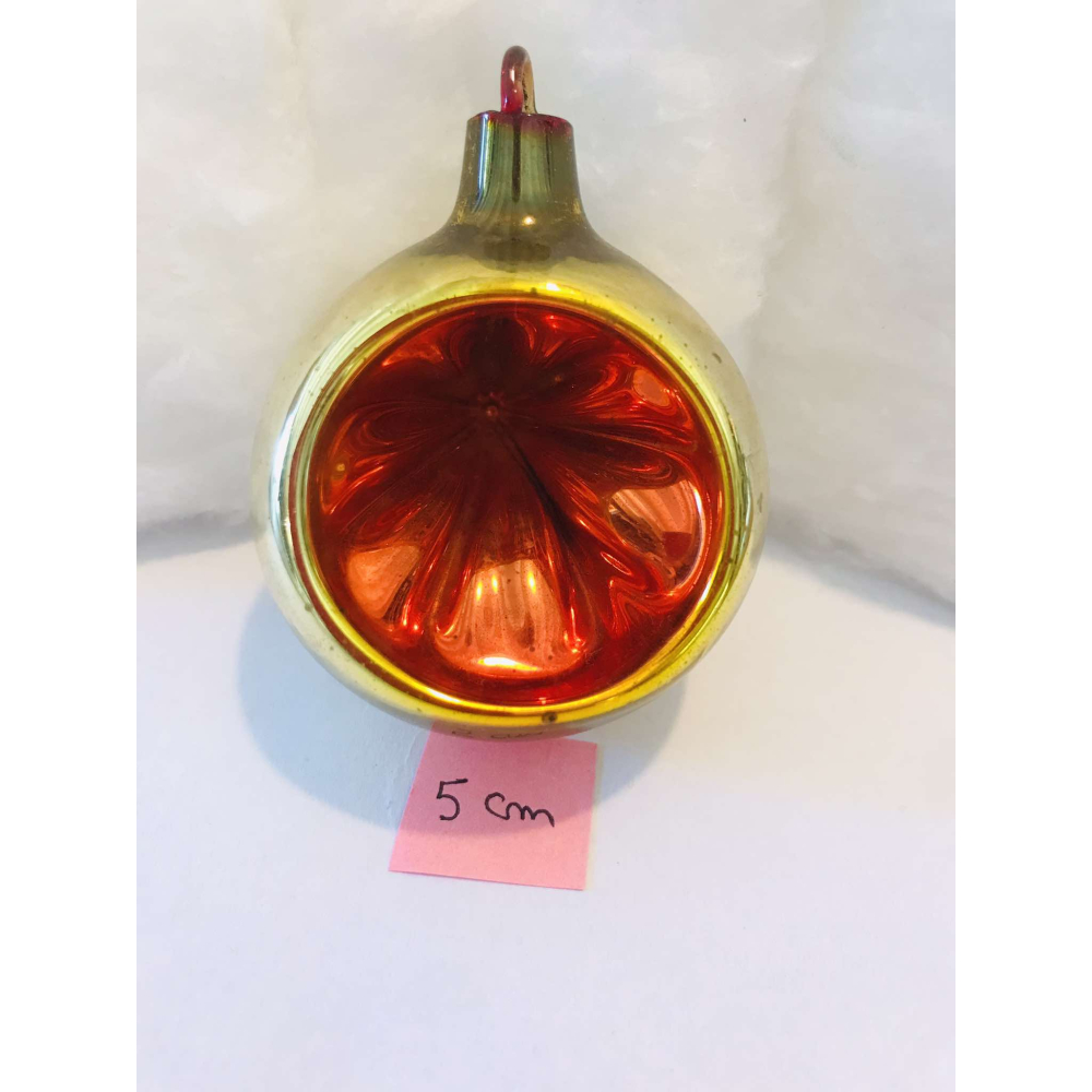 Dit is een kerstbal van Ajeko. De kerstbal heeft in het midden een oranje kleur, deze is bekomen doordat in deze reeks kerstballen ze goud hebben gebruikt om het oranje tot dieporanje te krijgen in het zonnetje van de kerstbal. Deze specifieke bal heeft een diep oranje kleur bijna rood gekregen in het zonnetje, wat wijst op een uiterst geslaagd resultaat, deze diepe kleur was zelden haalbaar. Zeldzaamheidsgraad 3 in de Ajeko catalogus 5cm