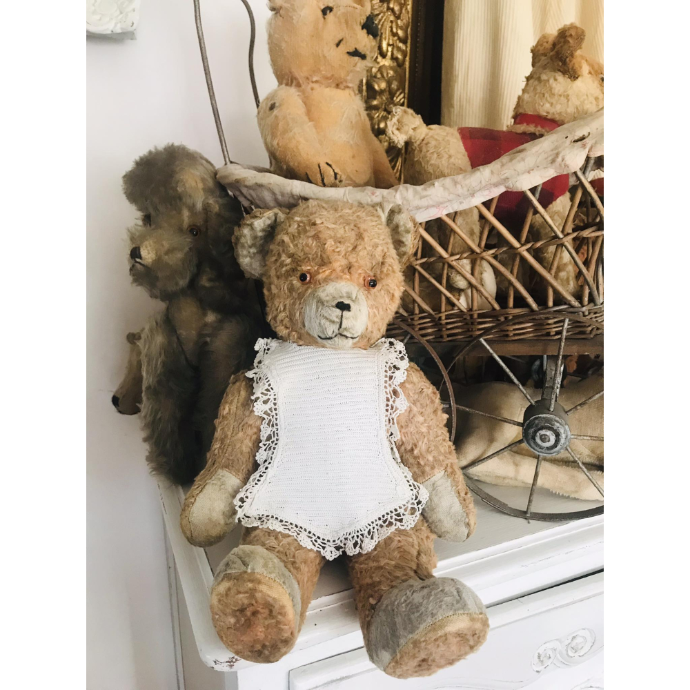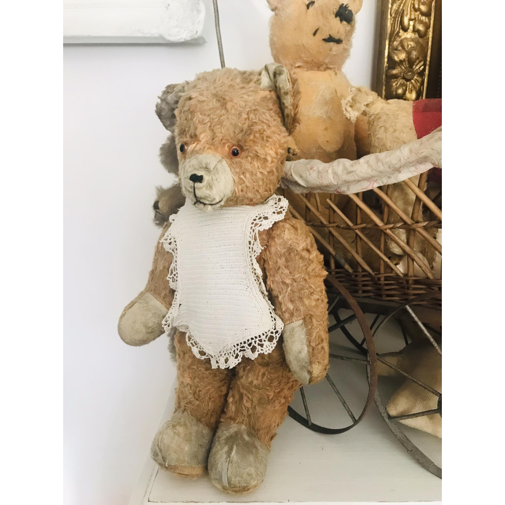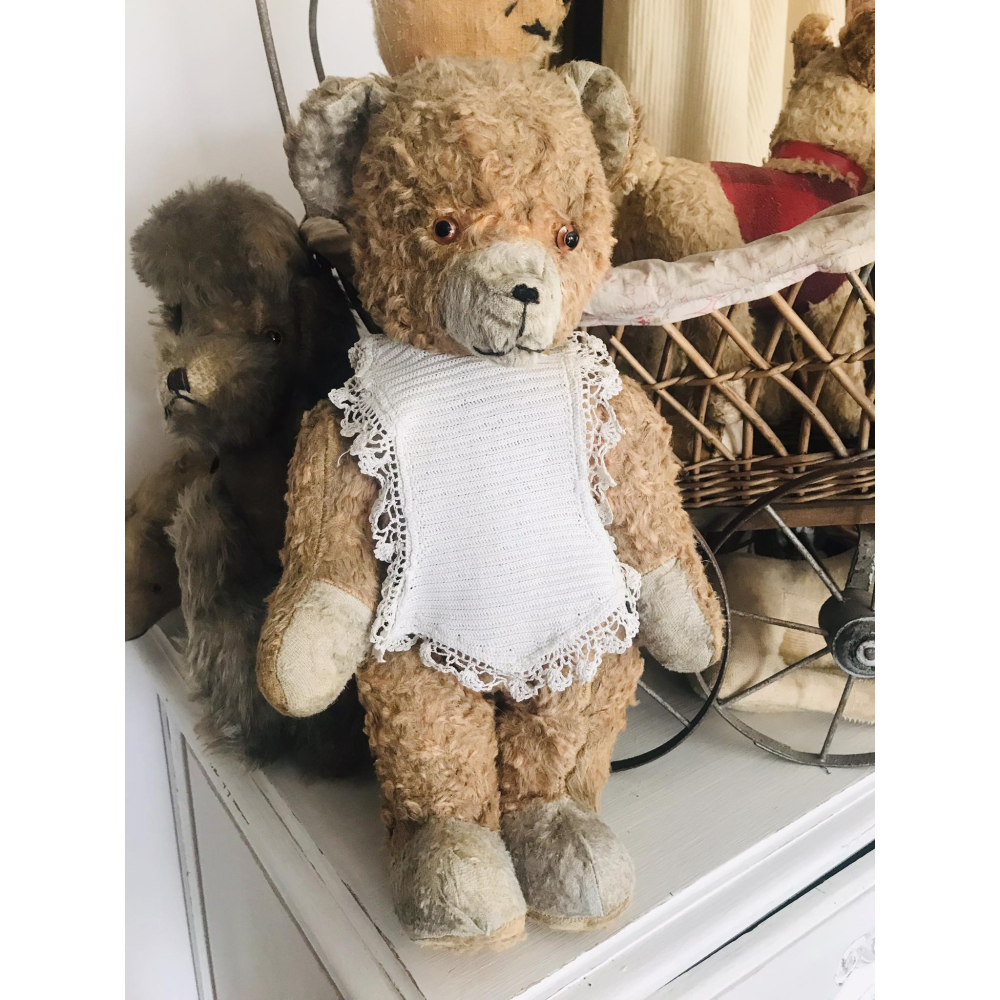 Hij is nog in hele goede staat dit oudje, gevuld met stro en heeft een heel leuk slabbetje aan. 40cm groot