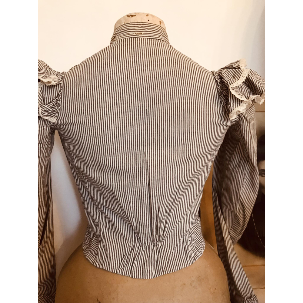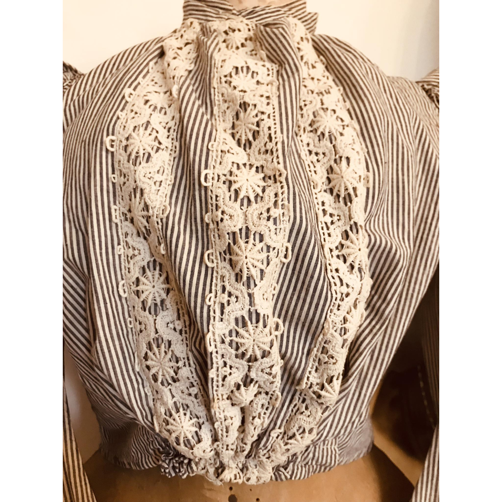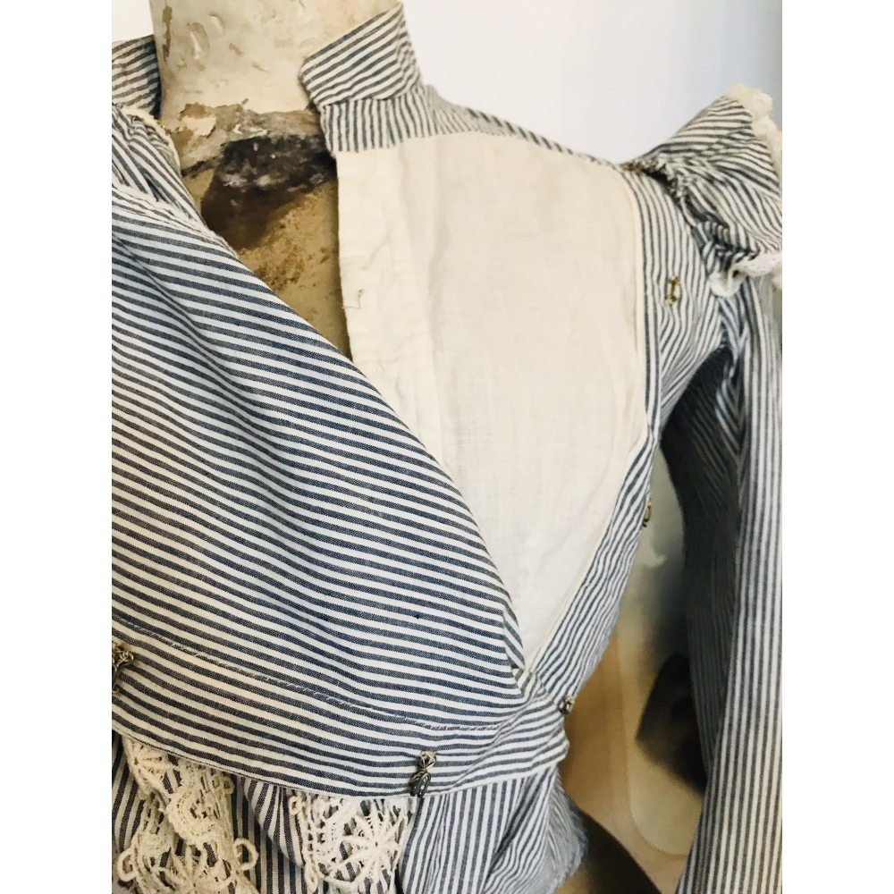 Deze bodice verkeerd in bijna perfecte staat, heel mooi in een licht Brocante interior, de pof op de borst afgewerkt met kant maakt het een echte blikvanger. Let op, dit is een antiek stuk, kan sporen hebben van de tand des tijds: vlekje, verkleuring, gaatje of een haakje die mist. Deze stukken hebben over het algemeen heel smalle tailles, waaronder ook deze bodice. Taille 58cm