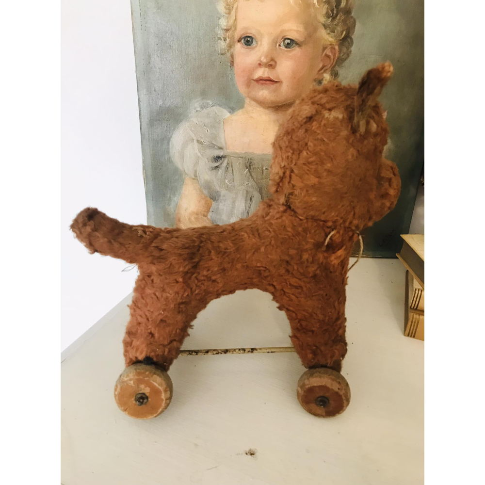 Hij is in shabby en gespeelde staat dit super schattig hondje op wielen. Het is een oudje, hij is gevuld met stro en heeft sporen van de tand des tijds. 28cm hoog 25cm lang