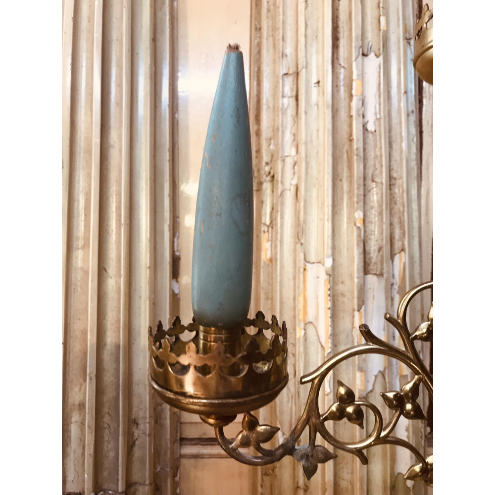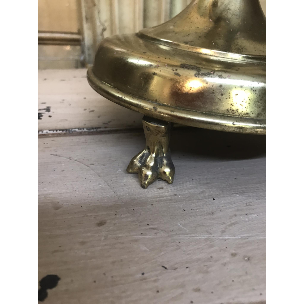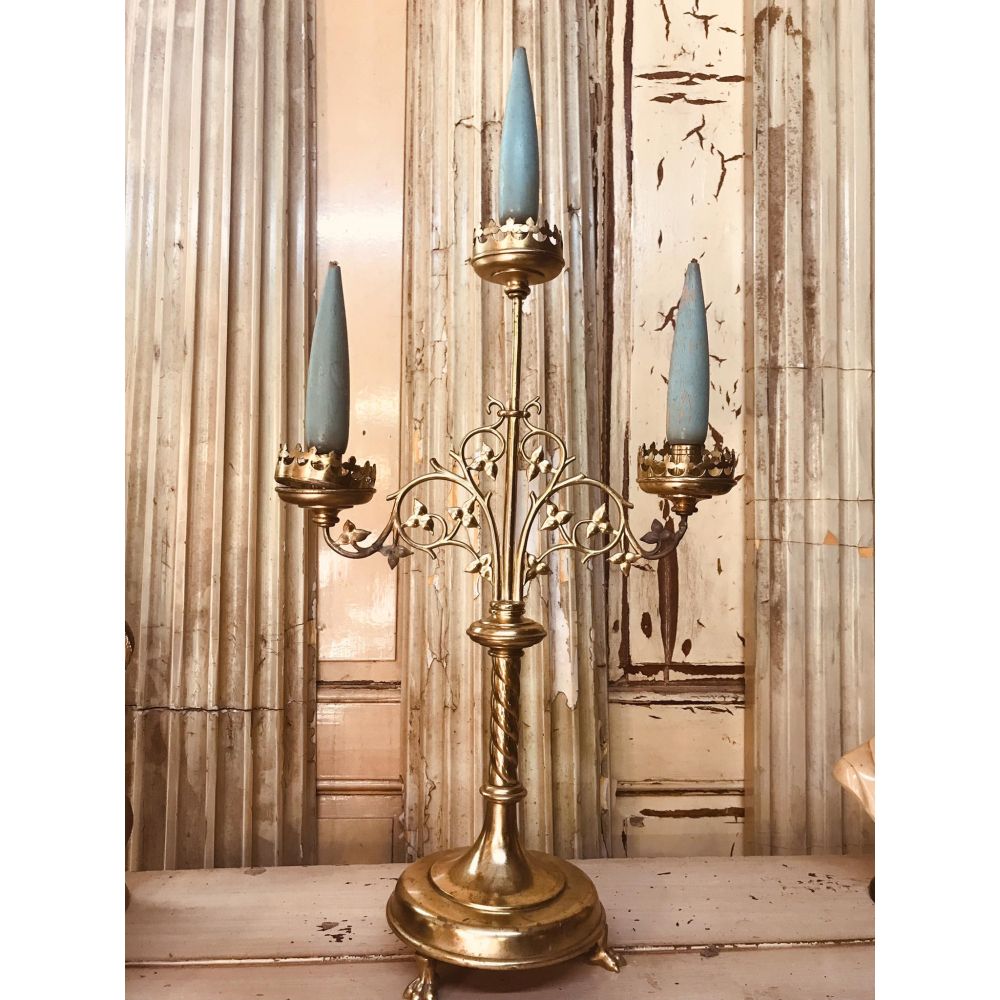 Uitzonderlijk mooi stuk deze koperen kerkkandelaar, afgewerkt met de stoere leeuwenpootjes onderaan en met de nog houten kaarsjes met lont erin aanwezig. Streling voor het oog